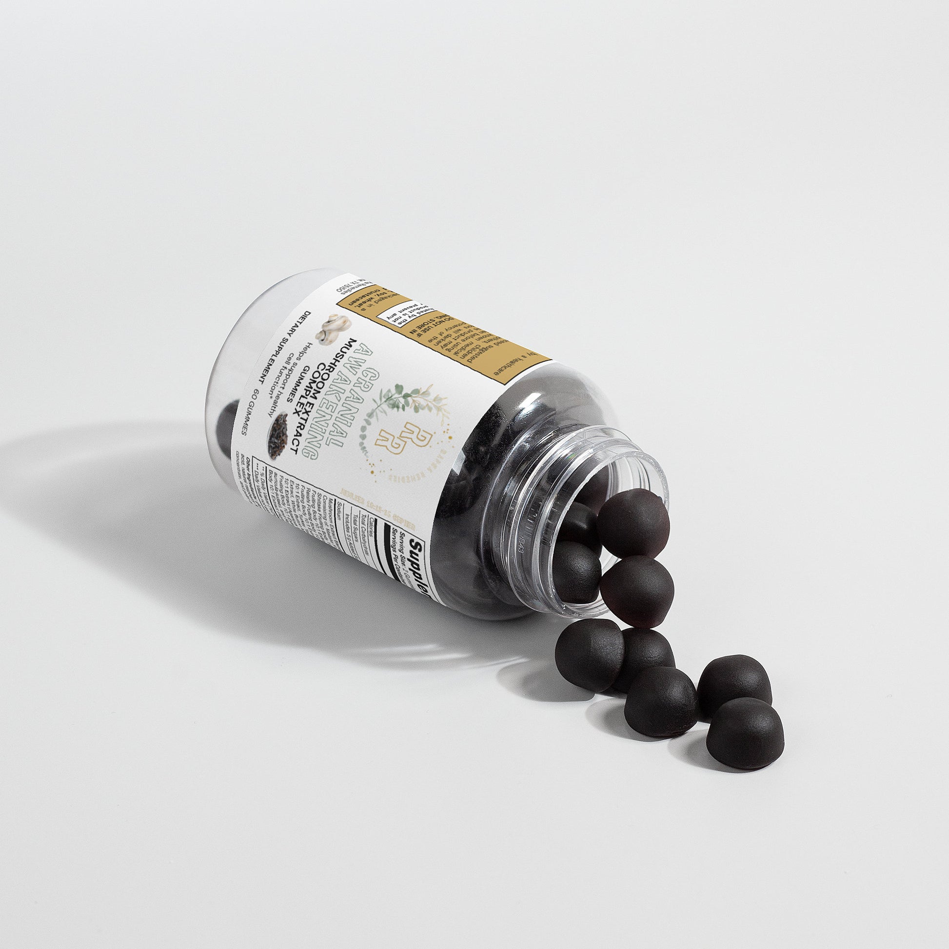 Our Mushroom Extract Complex Gummies combine the most sought-after mushrooms in the world: Maitake, Shiitake, Lion's Mane, Reishi, Cordyceps, Chaga, Turkey Tail, White Button Mushroom, Black Fungus, and Royal Sun Mushrooms.